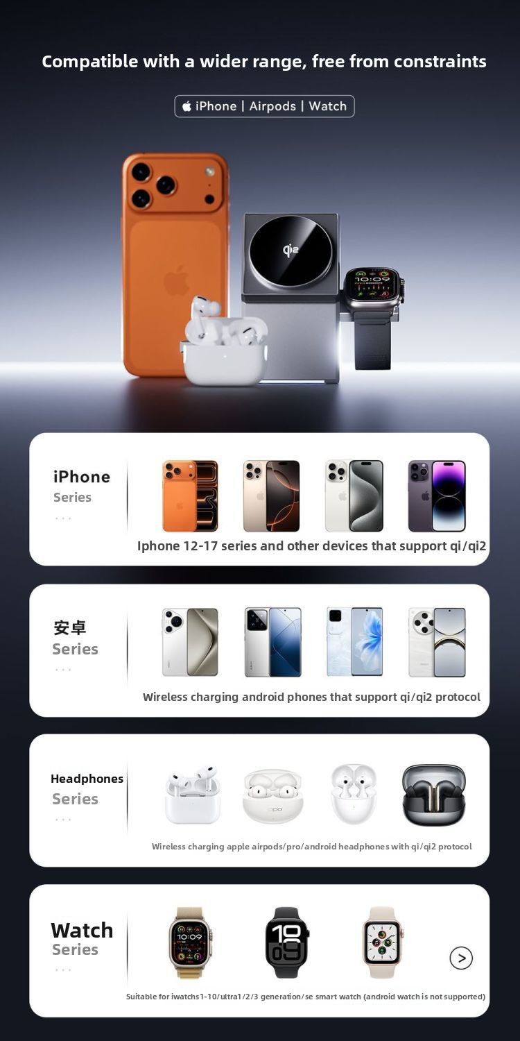 Output: Phone 15W/10W/7.5W/5W, Watch 2.5W, Earbuds 2.5W