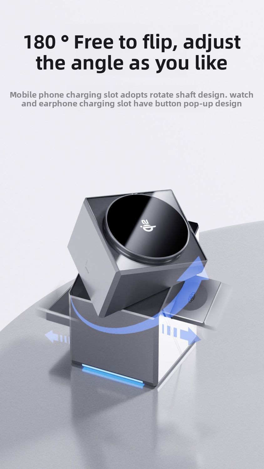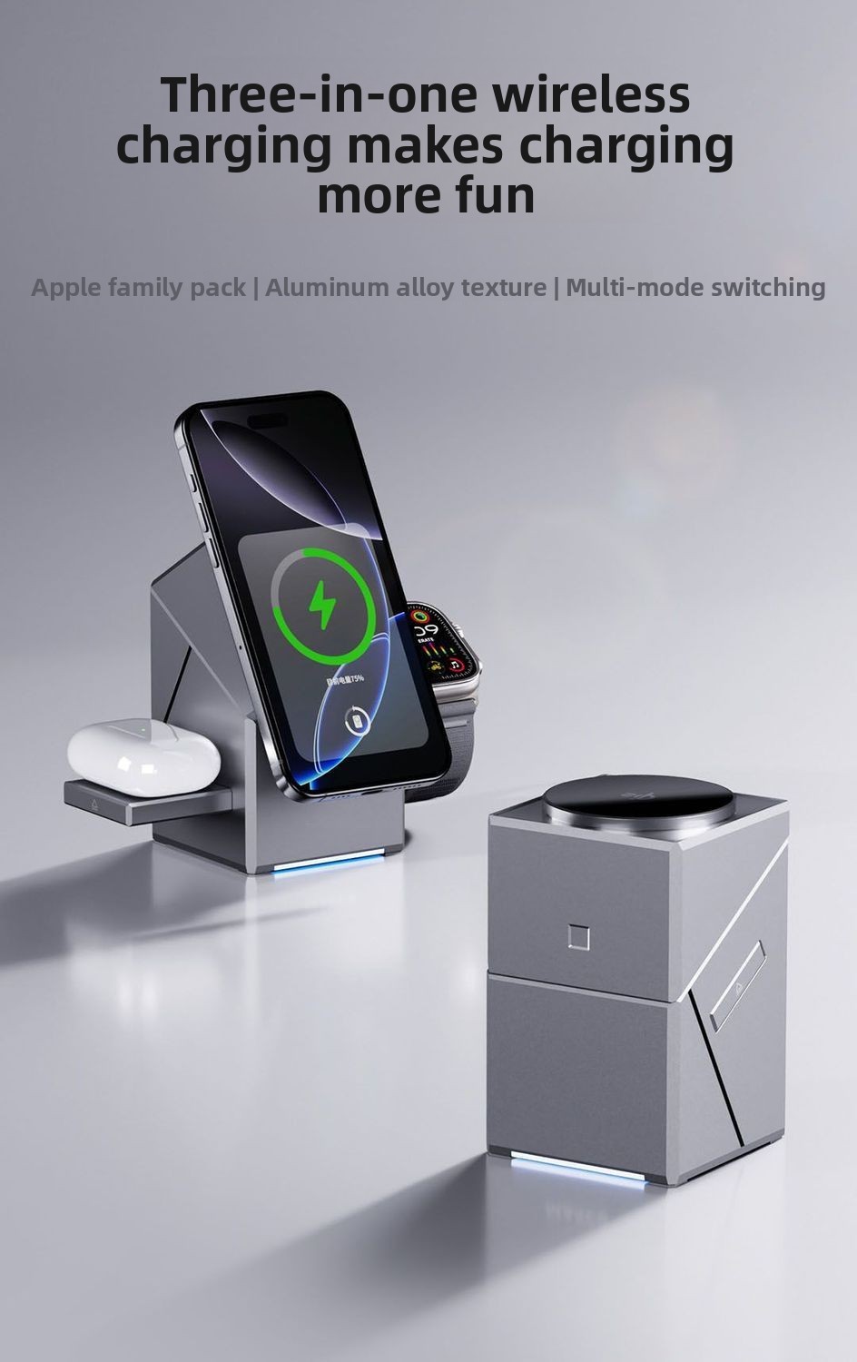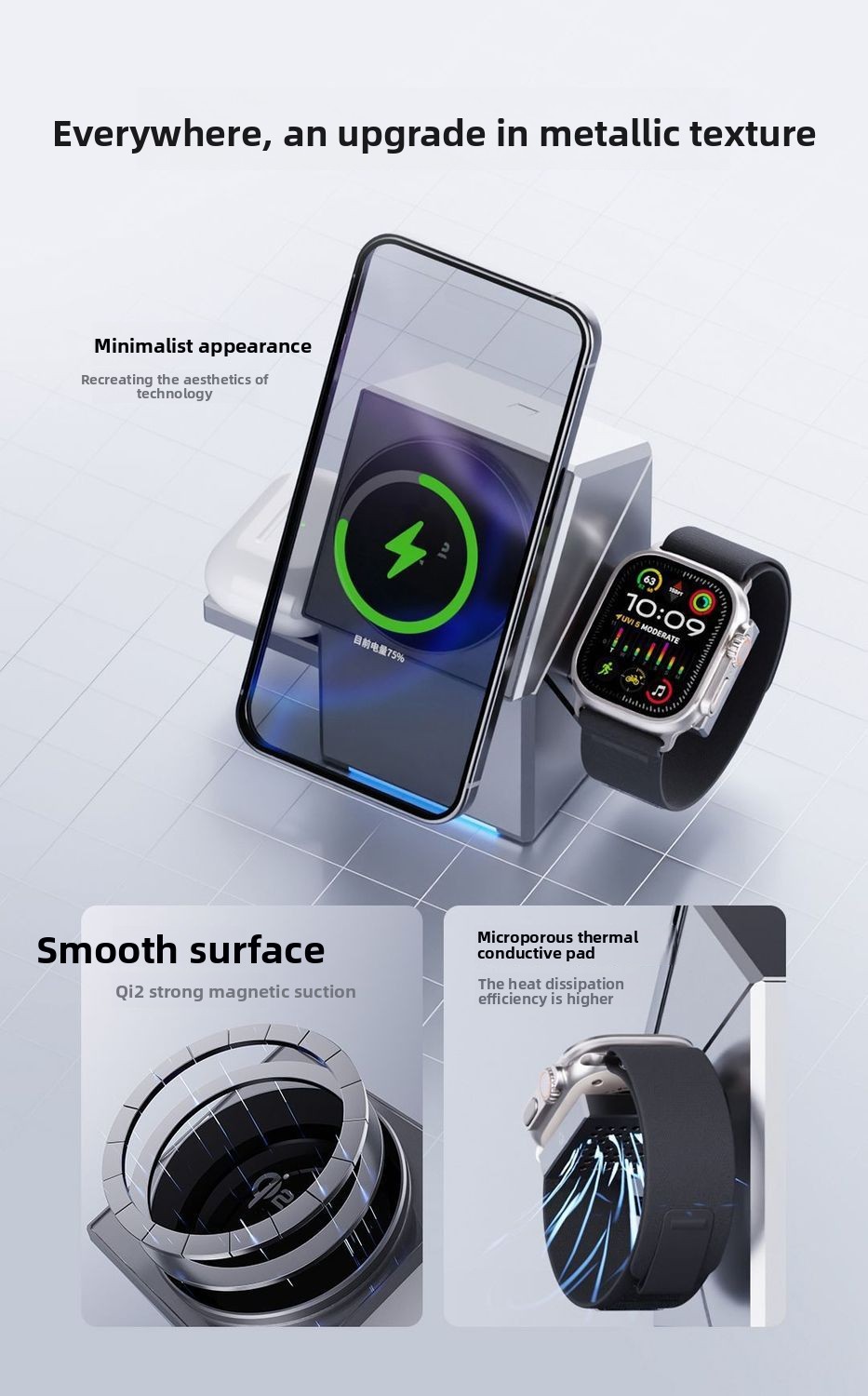 Three-in-One Charging: Simultaneously charges phone, watch, and wireless earbuds