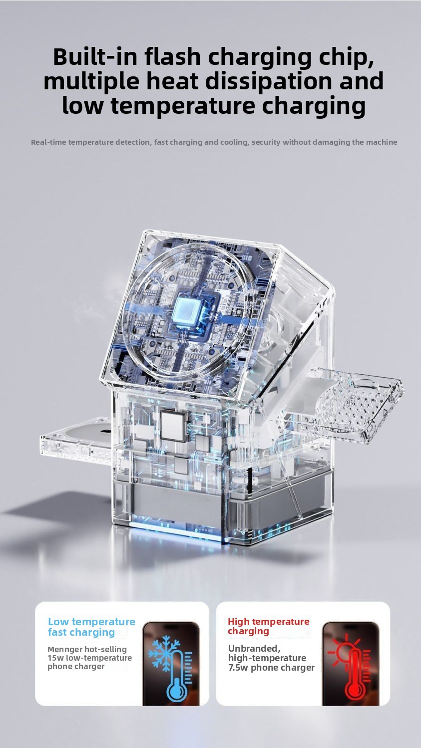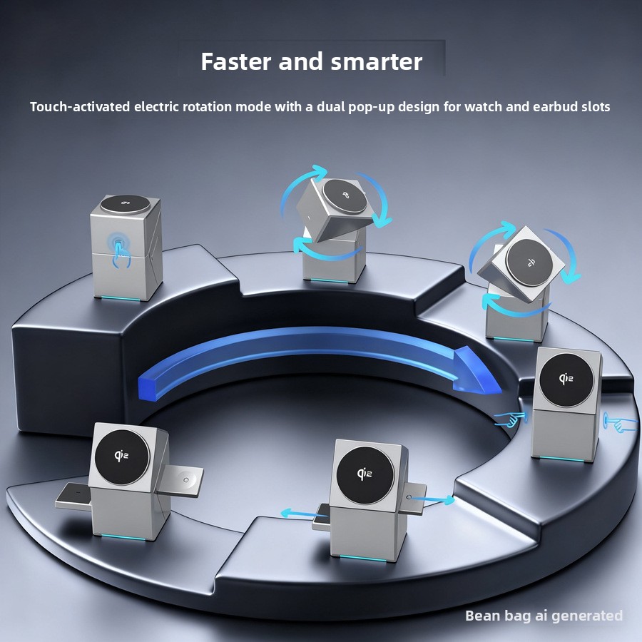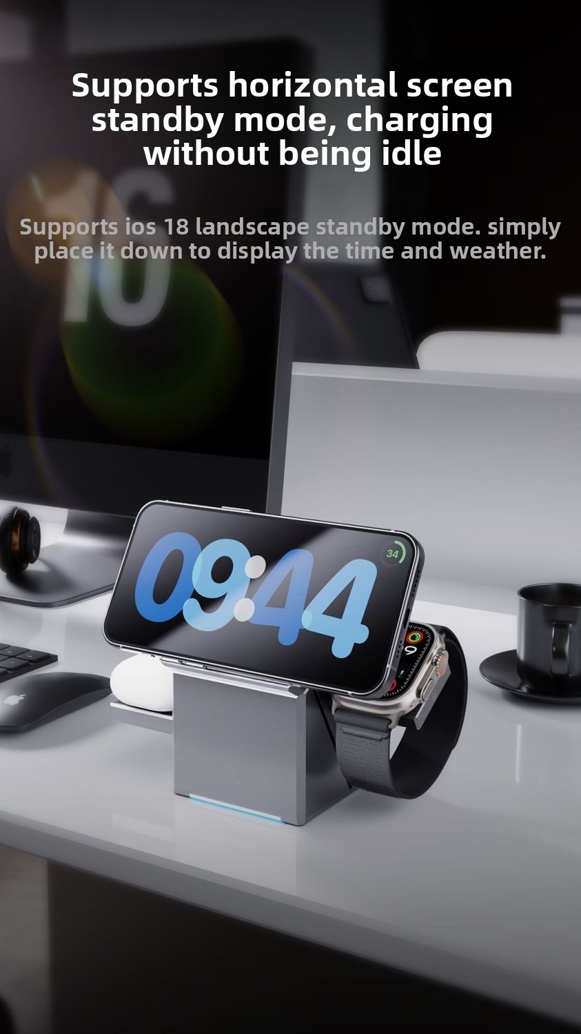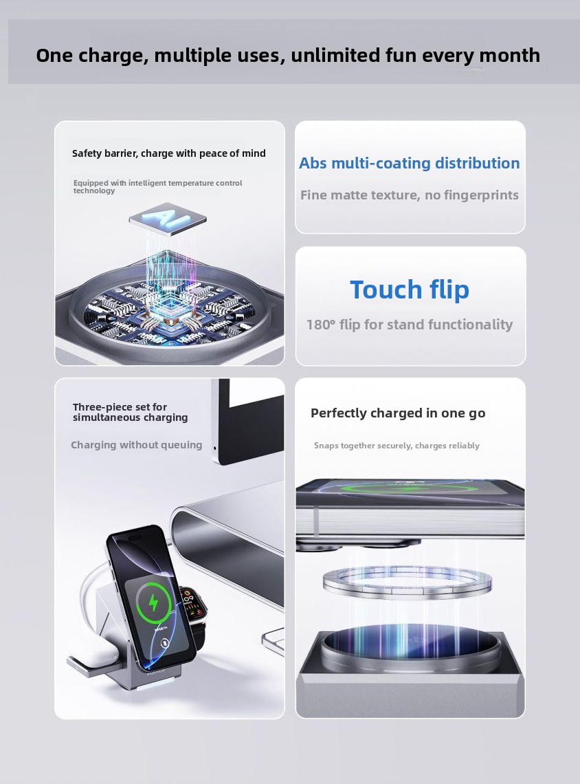 Three-in-One Charging: Simultaneously charges phone, watch, and wireless earbuds