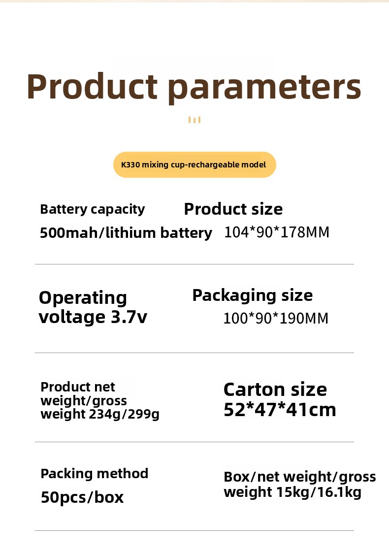 Capacity: Available in K330 Charging Model and K330 Dry Battery Model (Food-Grade PC)