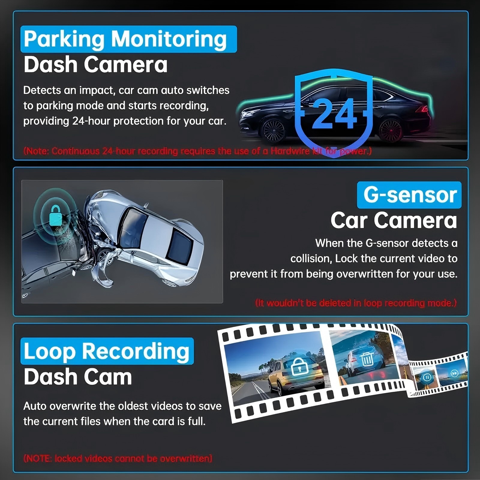 Collision Sensing: Activates emergency recording upon impact to preserve critical event footage.