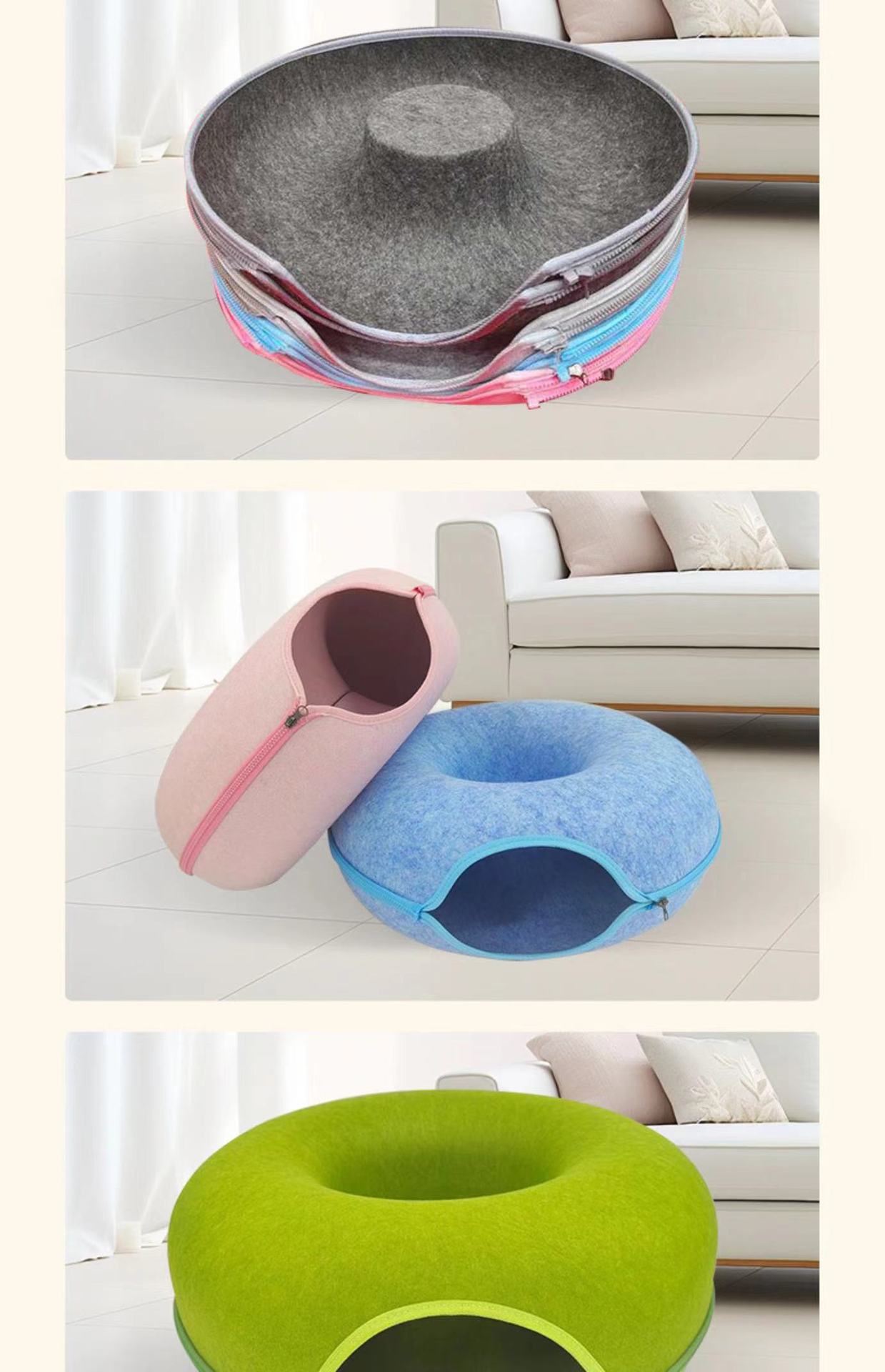 Donut Shape: Attractive and playful design that appeals to feline instincts for hiding and playing.