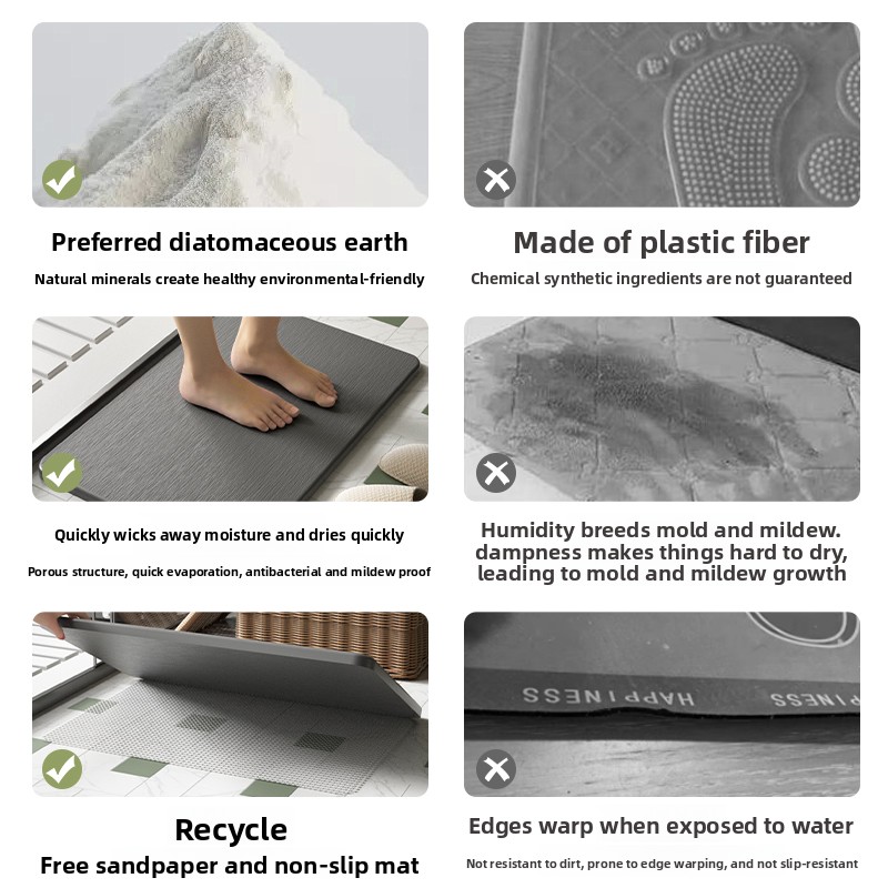 Quick Absorption: Diatomaceous earth material rapidly absorbs moisture, keeping floors dry