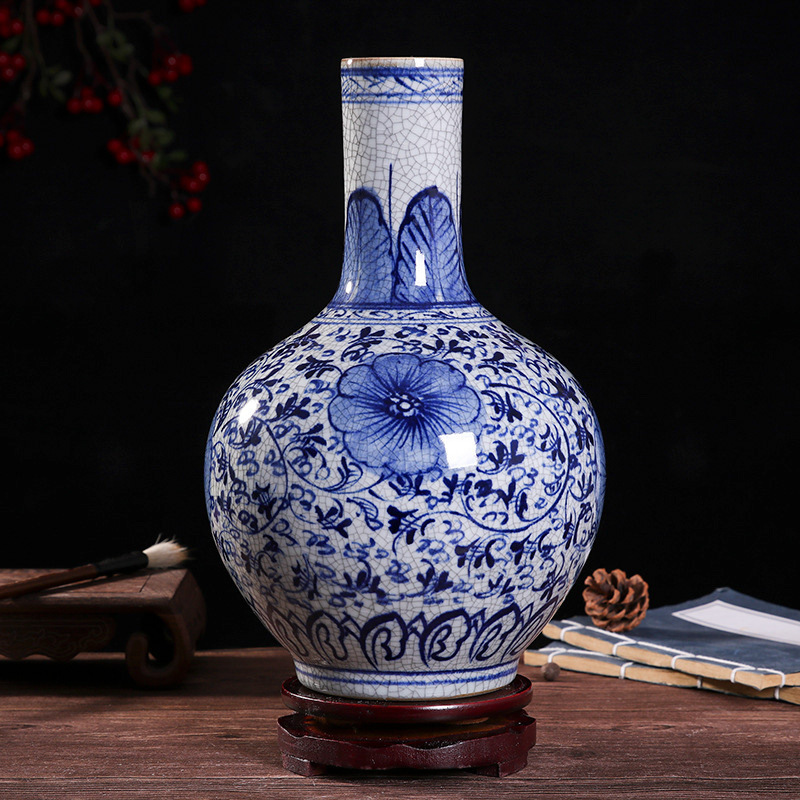 Hand-painted blue and white cracked glaze vase: 32cm