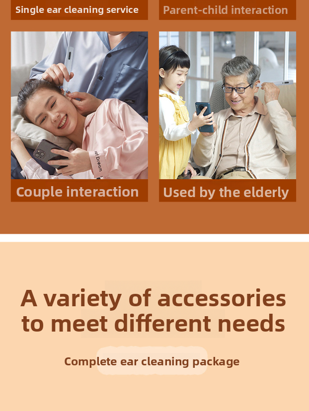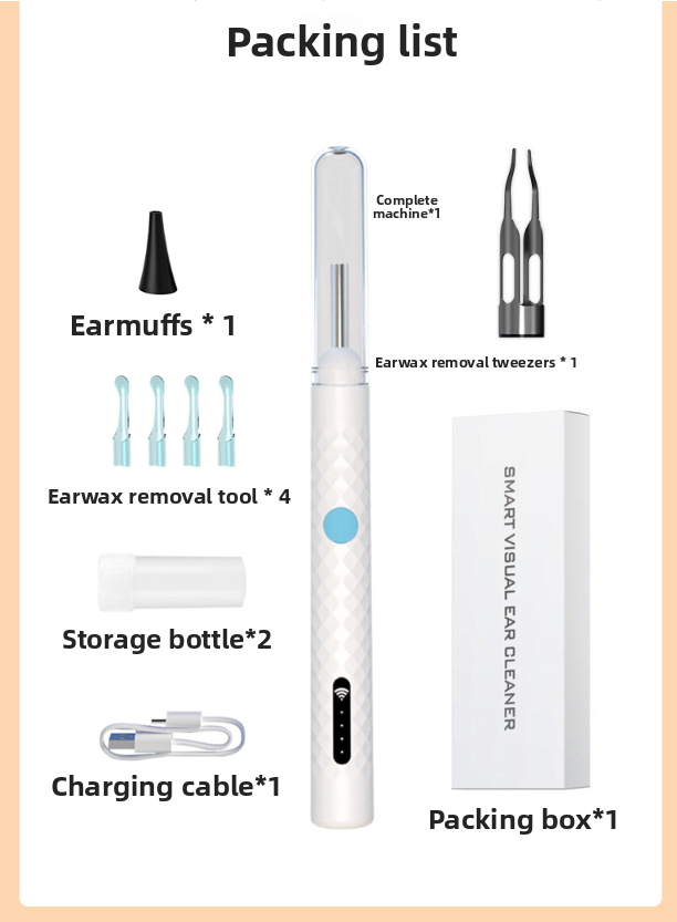 Package Contents: Main unit, various ear spoon attachments, tweezers, silicone covers, earmuffs, storage