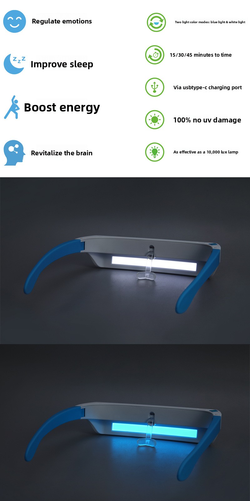 Dual Mode Therapy: Features blue and white light modes to accommodate individual sensitivity preferences for