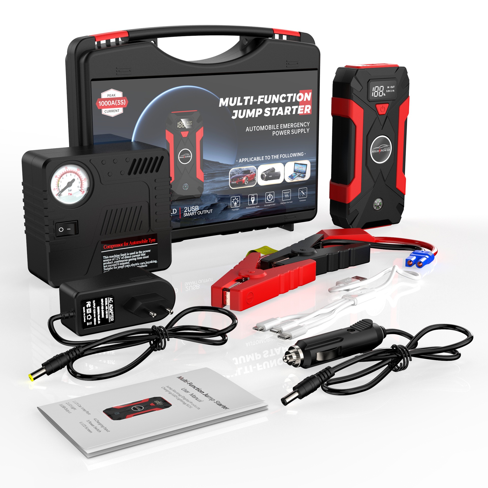 Portable car jump starter with multiple functions including mobile charging and air pump options.
